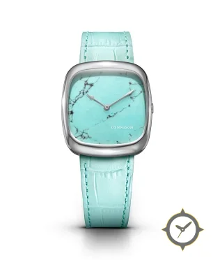 Eine Dress-Uhr mit einem 26.5mm Gehäuse im Vintage-Stil gefertigt aus Edelstahl mit einem Zifferblatt in türkis und einer besonderen "marble/stone (veined turquoise)"-Oberfläche.