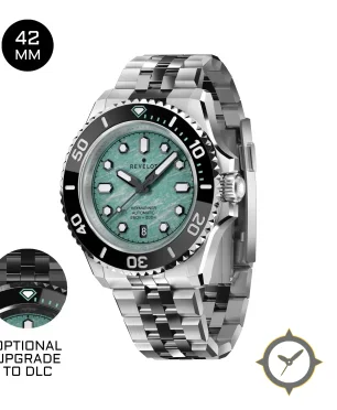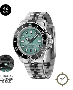 Eine Taucheruhr-Uhr mit einem markanten 49mm Auftritt am Handgelenk, gefertigt aus Edelstahl mit einem Zifferblatt in türkis und einer besonderen "stone/marbled texture"-Oberfläche.