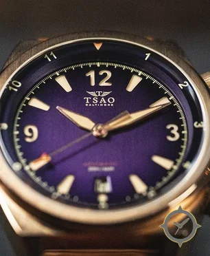 Eine Taucheruhr-Uhr mit einem markanten 47mm Auftritt am Handgelenk, gefertigt aus Bronze mit einem Zifferblatt in lila und einer besonderen "sunburst"-Oberfläche.