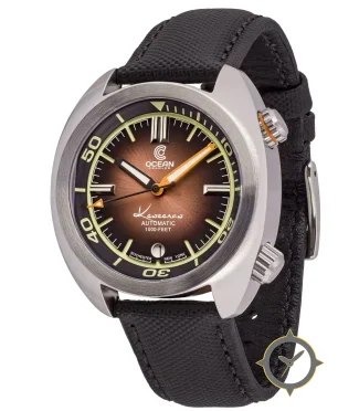 Eine Taucheruhr-Uhr mit einem markanten 44mm Auftritt am Handgelenk, gefertigt aus Edelstahl mit einem Zifferblatt in braun und einer besonderen "sunburst"-Oberfläche.