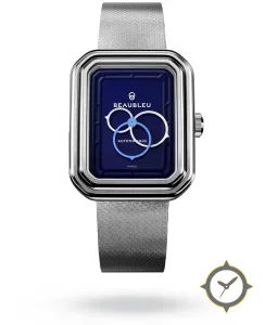 Eine Dress-Uhr mit einem vielseitigen 38.5mm Gehäuse, das an fast jedes Handgelenk passt, gefertigt aus Edelstahl mit einem Zifferblatt in marineblau und einer besonderen "stepped recessed dial with raised inner rectangular frame"-Oberfläche.