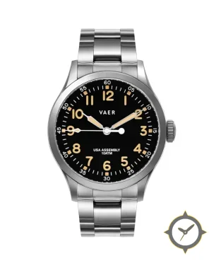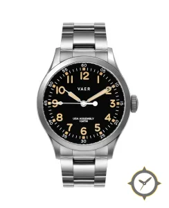 Eine Field-Uhr mit einem vielseitigen 39.5mm Gehäuse, das an fast jedes Handgelenk passt, gefertigt aus Edelstahl mit einem Zifferblatt in schwarz und einer besonderen "matte"-Oberfläche.