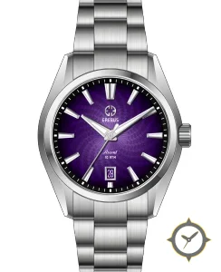 Eine Dress-Uhr mit einem 31.5mm Gehäuse im Vintage-Stil gefertigt aus Edelstahl mit einem Zifferblatt in lila und einer besonderen "radial guilloche / spiral pattern"-Oberfläche.