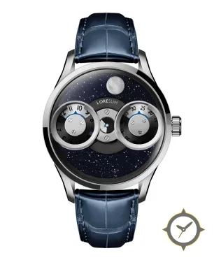 Eine Luxus-Uhr mit einem vielseitigen 40.5mm Gehäuse, das an fast jedes Handgelenk passt, gefertigt aus Edelstahl mit einem Zifferblatt in marineblau und einer besonderen "aventurine (starfield)"-Oberfläche und einer wunderschönen Mondphasenanzeige.