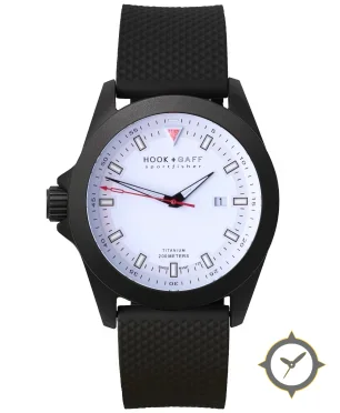 Eine Taucheruhr-Uhr mit einem markanten 46mm Auftritt am Handgelenk, gefertigt aus Titan mit einem Zifferblatt in weiß und einer besonderen "matte"-Oberfläche.