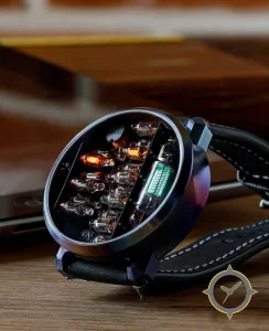 Eine Skelett-Uhr mit einem markanten 47mm Auftritt am Handgelenk, gefertigt aus Edelstahl mit einem Zifferblatt in schwarz und einer besonderen "exposed electronic components / open-work (visible tubes and circuitry)"-Oberfläche.