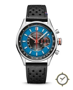 Eine Racing-Uhr mit einem markanten 45mm Auftritt am Handgelenk, gefertigt aus Edelstahl mit einem Zifferblatt in blau und einer besonderen "sunburst center with matte outer ring"-Oberfläche.