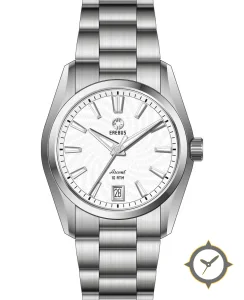 Eine Sport-Uhr mit einem 34.5mm Gehäuse im Vintage-Stil gefertigt aus Edelstahl mit einem Zifferblatt in weiß und einer besonderen "radial guilloche"-Oberfläche.