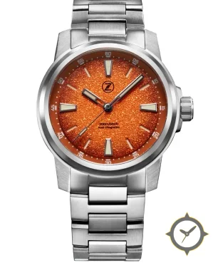 Eine Taucheruhr-Uhr mit einem vielseitigen 39mm Gehäuse, das an fast jedes Handgelenk passt, gefertigt aus Edelstahl mit einem Zifferblatt in orange und einer besonderen "granular/sparkling texture (sandpaper-like glitter)"-Oberfläche.