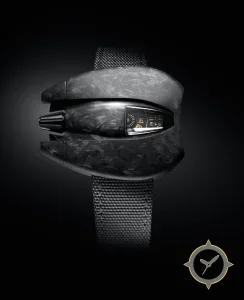Eine Luxus-Uhr mit einem 34.5mm Gehäuse im Vintage-Stil gefertigt aus Carbon mit einem Zifferblatt in schwarz und einer besonderen "glossy/polished"-Oberfläche und einer praktischen Gangreserveanzeige.