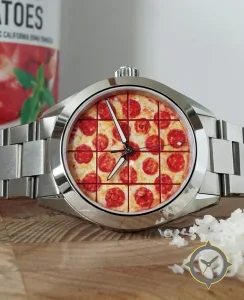 Eine Sport-Uhr mit einem 37.5mm Gehäuse im Vintage-Stil gefertigt aus Edelstahl mit einem Zifferblatt in rot und einer besonderen "printed-photo"-Oberfläche.