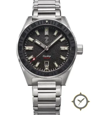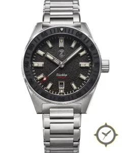 Eine Taucheruhr-Uhr mit einem 37mm Gehäuse im Vintage-Stil gefertigt aus Edelstahl mit einem Zifferblatt in schwarz und einer besonderen "textured/grain (matte rough finish)"-Oberfläche.