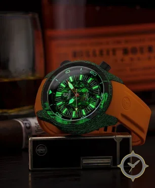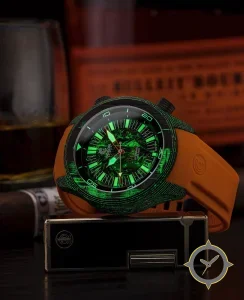 Eine Taucheruhr-Uhr mit einem 36mm Gehäuse im Vintage-Stil gefertigt aus Carbon mit einem Zifferblatt in grün und einer besonderen "marbled / heavily lumed texture"-Oberfläche.