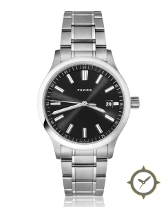 Eine Minimalistisch-Uhr mit einem 33mm Gehäuse im Vintage-Stil gefertigt aus Edelstahl mit einem Zifferblatt in schwarz und einer besonderen "sunburst (radial brushing)"-Oberfläche.