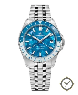 Eine GMT-Uhr mit einem markanten 41.5mm Auftritt am Handgelenk, gefertigt aus Edelstahl mit einem Zifferblatt in blau und einer besonderen "mother-of-pearl geometric mosaic"-Oberfläche und einer echten GMT-Funktion, mit der du eine zweite Zeitzone verfolgen kannst.