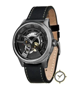 Eine Skelett-Uhr mit einem markanten 46.5mm Auftritt am Handgelenk, gefertigt aus Edelstahl mit einem Zifferblatt in schwarz und einer besonderen "ribbed, open-work / skeletonized"-Oberfläche.