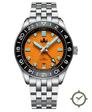 Eine GMT-Uhr mit einem 36.5mm Gehäuse im Vintage-Stil gefertigt aus Edelstahl mit einem Zifferblatt in orange und einer besonderen "wavy (embossed wave pattern)"-Oberfläche und einer echten GMT-Funktion, mit der du eine zweite Zeitzone verfolgen kannst.