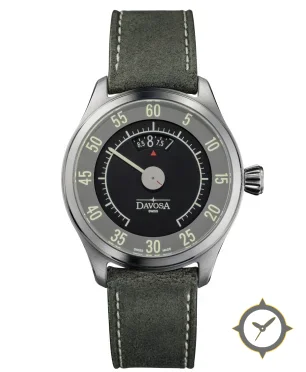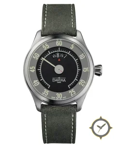 Eine Pilot-Uhr mit einem 35.5mm Gehäuse im Vintage-Stil gefertigt aus Edelstahl mit einem Zifferblatt in schwarz und einer besonderen "matte"-Oberfläche und einer praktischen Gangreserveanzeige.