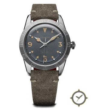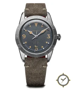 Eine Vintage-Uhr mit einem 29mm Gehäuse im Vintage-Stil gefertigt aus Edelstahl mit einem Zifferblatt in blau und einer besonderen "textured/grainy"-Oberfläche.