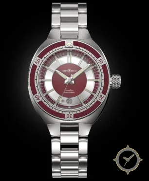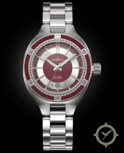 Eine Taucheruhr-Uhr mit einem 35mm Gehäuse im Vintage-Stil gefertigt aus Edelstahl mit einem Zifferblatt in karmesinrot und einer besonderen "brushed center with matte outer ring"-Oberfläche.
