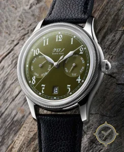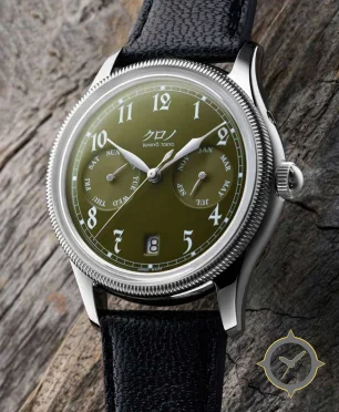 Eine Dress-Uhr mit einem 34.5mm Gehäuse im Vintage-Stil gefertigt aus Edelstahl mit einem Zifferblatt in grün und einer besonderen "matte lacquer"-Oberfläche und einer echten GMT-Funktion, mit der du eine zweite Zeitzone verfolgen kannst.