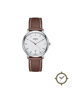 Eine Dress-Uhr mit einem 34mm Gehäuse im Vintage-Stil gefertigt aus Edelstahl mit einem Zifferblatt in weiß und einer besonderen "smooth"-Oberfläche.