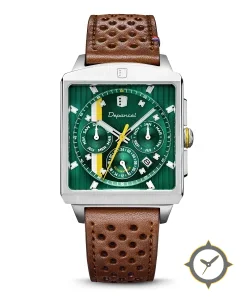 Eine Racing-Uhr mit einem 37mm Gehäuse im Vintage-Stil gefertigt aus Edelstahl mit einem Zifferblatt in grün und einer besonderen "vertical brushed / ribbed finish"-Oberfläche.