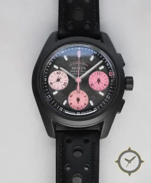 Eine Chronograph-Uhr mit einem markanten 44.5mm Auftritt am Handgelenk, gefertigt aus Beschichtung mit einem Zifferblatt in schwarz und einer besonderen "textured, slightly grainy/sparkle finish"-Oberfläche.