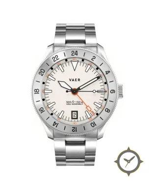 Eine GMT-Uhr mit einem 37mm Gehäuse im Vintage-Stil gefertigt aus Edelstahl mit einem Zifferblatt in weiß und einer besonderen "matte"-Oberfläche und einer echten GMT-Funktion, mit der du eine zweite Zeitzone verfolgen kannst.