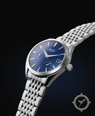 Eine Dress-Uhr mit einem 33mm Gehäuse im Vintage-Stil gefertigt aus Edelstahl mit einem Zifferblatt in blau und einer besonderen "radial sunburst (brushed)"-Oberfläche und einer praktischen Gangreserveanzeige.