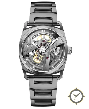 Eine Skelett-Uhr mit einem vielseitigen 39.5mm Gehäuse, das an fast jedes Handgelenk passt, gefertigt aus Edelstahl mit einem Zifferblatt in silber und einer besonderen "skeletonized, open-work movement visible"-Oberfläche.