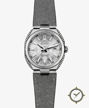 Eine Luxus-Uhr mit einem markanten 44mm Auftritt am Handgelenk, gefertigt aus Edelstahl mit einem Zifferblatt in silber und einer besonderen "sunburst"-Oberfläche.