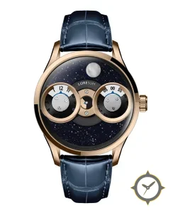 Eine Luxus-Uhr mit einem markanten 44.5mm Auftritt am Handgelenk, gefertigt aus Gold mit einem Zifferblatt in marineblau und einer besonderen "aventurine (starry)"-Oberfläche und einer wunderschönen Mondphasenanzeige.