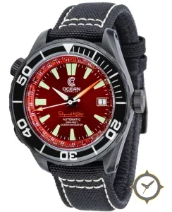 Eine Taucheruhr-Uhr mit einem markanten 46mm Auftritt am Handgelenk, gefertigt aus Edelstahl mit einem Zifferblatt in rot und einer besonderen "sunburst lacquer"-Oberfläche.