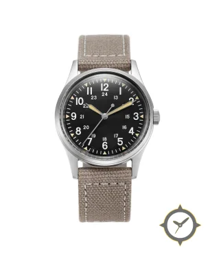Eine Field-Uhr mit einem 34.5mm Gehäuse im Vintage-Stil gefertigt aus Edelstahl mit einem Zifferblatt in schwarz und einer besonderen "matte"-Oberfläche.