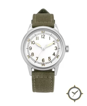 Eine Field-Uhr gefertigt aus Edelstahl mit einem Zifferblatt in weiß und einer besonderen "matte"-Oberfläche.