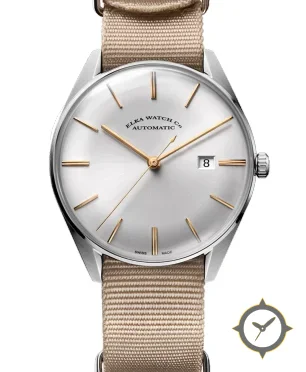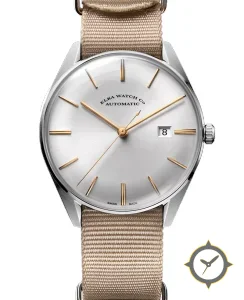 Eine Dress-Uhr mit einem markanten 44.5mm Auftritt am Handgelenk, gefertigt aus Edelstahl mit einem Zifferblatt in silber und einer besonderen "sunburst (radial brushed)"-Oberfläche.