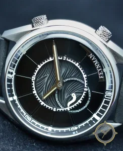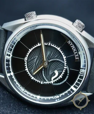 Eine Taucheruhr-Uhr mit einem vielseitigen 40mm Gehäuse, das an fast jedes Handgelenk passt, gefertigt aus Edelstahl mit einem Zifferblatt in schwarz und einer besonderen "guilloché / engraved wave pattern"-Oberfläche.