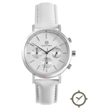Eine Chronograph-Uhr mit einem 36.5mm Gehäuse im Vintage-Stil gefertigt aus Edelstahl mit einem Zifferblatt in weiß und einer besonderen "matte"-Oberfläche.
