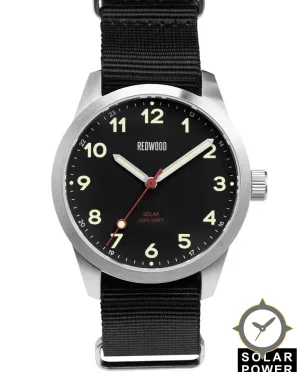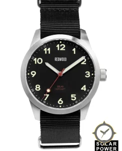 Eine Field-Uhr mit einem 37.5mm Gehäuse im Vintage-Stil gefertigt aus Edelstahl mit einem Zifferblatt in schwarz und einer besonderen "matte"-Oberfläche.