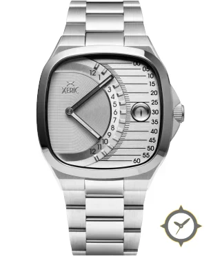 Eine Minimalistisch-Uhr mit einem markanten 42.5mm Auftritt am Handgelenk, gefertigt aus Edelstahl mit einem Zifferblatt in silber und einer besonderen "brushed concentric guilloche with horizontal brushed sectors"-Oberfläche.