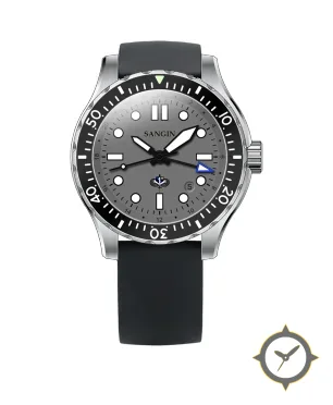 Eine Taucheruhr-Uhr mit einem markanten 43.5mm Auftritt am Handgelenk, gefertigt aus Edelstahl mit einem Zifferblatt in grau und einer besonderen "matte"-Oberfläche.