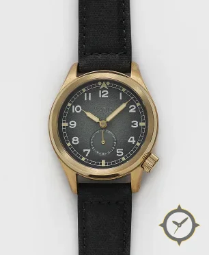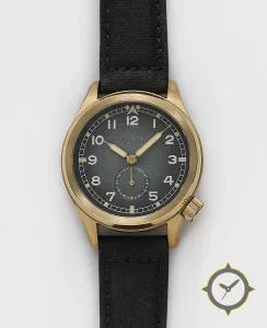 Eine Field-Uhr mit einem 35.5mm Gehäuse im Vintage-Stil gefertigt aus Bronze mit einem Zifferblatt in grau und einer besonderen "matte grained finish"-Oberfläche.