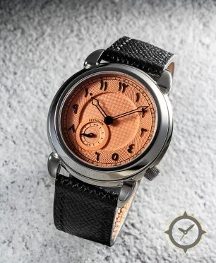 Eine Dress-Uhr mit einem vielseitigen 38mm Gehäuse, das an fast jedes Handgelenk passt, gefertigt aus Edelstahl mit einem Zifferblatt in orange und einer besonderen "guilloché (engine-turned)"-Oberfläche.