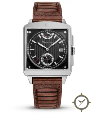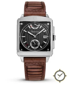 Eine Fahrer-Uhr mit einem markanten 46mm Auftritt am Handgelenk, gefertigt aus Edelstahl mit einem Zifferblatt in schwarz und einer besonderen "vertical guilloché / striped texture"-Oberfläche und einer praktischen Gangreserveanzeige.