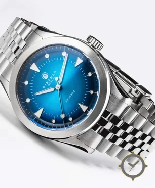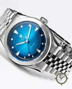 Eine Sport-Uhr mit einem 32.5mm Gehäuse im Vintage-Stil gefertigt aus Edelstahl mit einem Zifferblatt in blau und einer besonderen "sunburst"-Oberfläche.