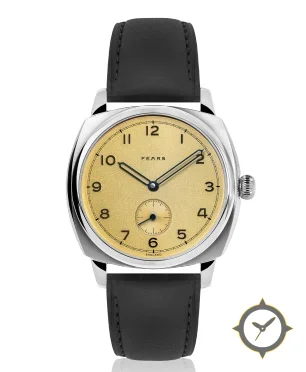 Eine Vintage-Uhr mit einem 37mm Gehäuse im Vintage-Stil gefertigt aus Edelstahl mit einem Zifferblatt in gold und einer besonderen "grained"-Oberfläche.