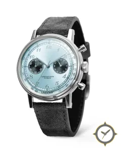 Eine Chronograph-Uhr mit einem 36.5mm Gehäuse im Vintage-Stil gefertigt aus Edelstahl mit einem Zifferblatt in türkis und einer besonderen "sunburst"-Oberfläche.