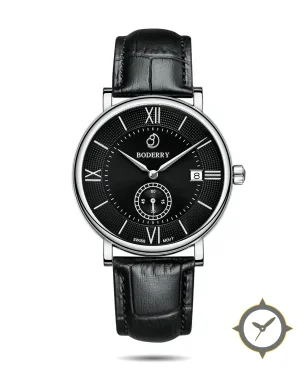 Eine Dress-Uhr mit einem 35mm Gehäuse im Vintage-Stil gefertigt aus Edelstahl mit einem Zifferblatt in schwarz und einer besonderen "textured (guilloché outer ring, smooth center)"-Oberfläche.