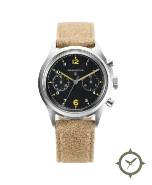 Eine Chronograph-Uhr mit einem 37.5mm Gehäuse im Vintage-Stil gefertigt aus Edelstahl mit einem Zifferblatt in schwarz und einer besonderen "matte grained"-Oberfläche.